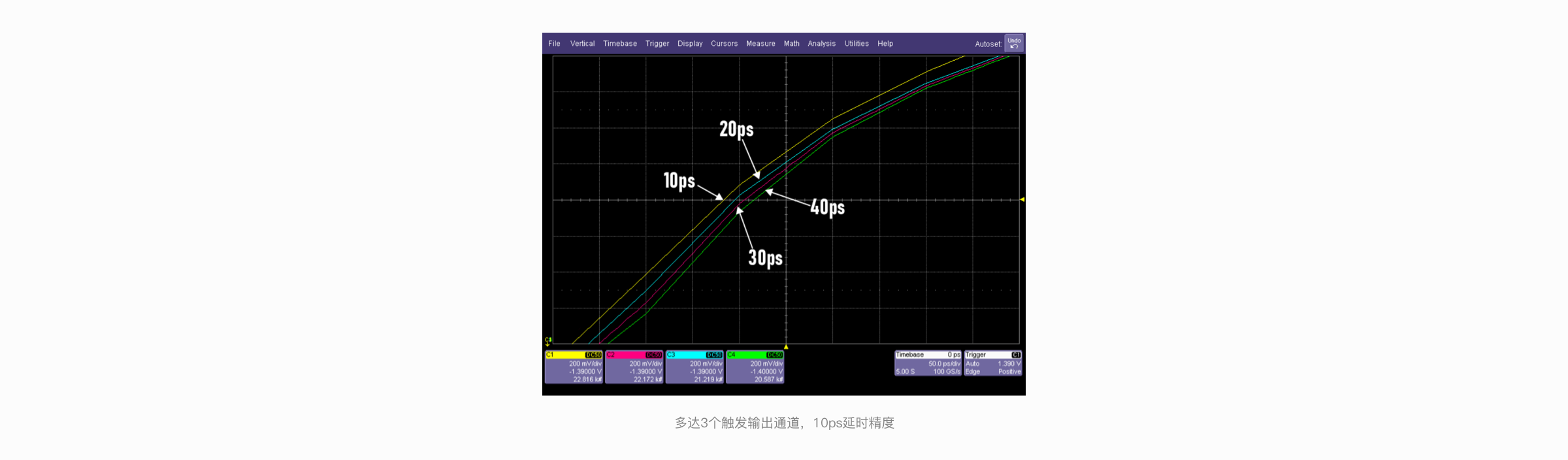 最大触发频率125MHz,支持任意分频;触发阈值0.3V-3.3V可设置;输入阻抗50Ω/10KΩ可设置;最小触发宽度3ns;触发抖动<35ps |
