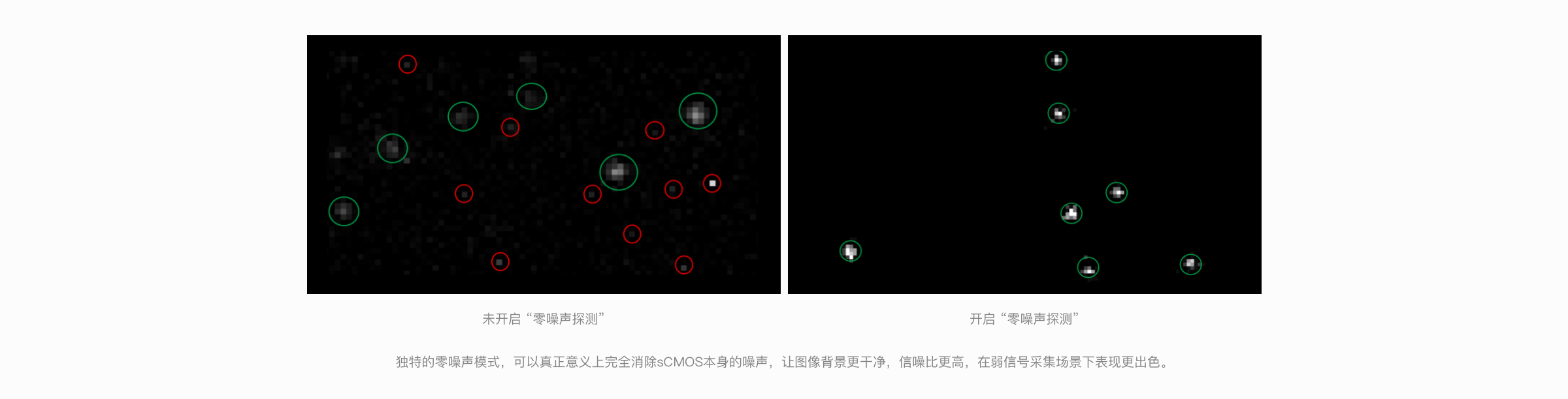 对比以上两幅图像,在未启动“零噪声探测”模式时,图像中存在很多单像素级结构(红色圈标识的部分),而在启动“零噪声探测”模式后,图像中这种单像素结构被完全消除,而呈现出来的都是多像素团状结构(绿色圈标识的部分)。